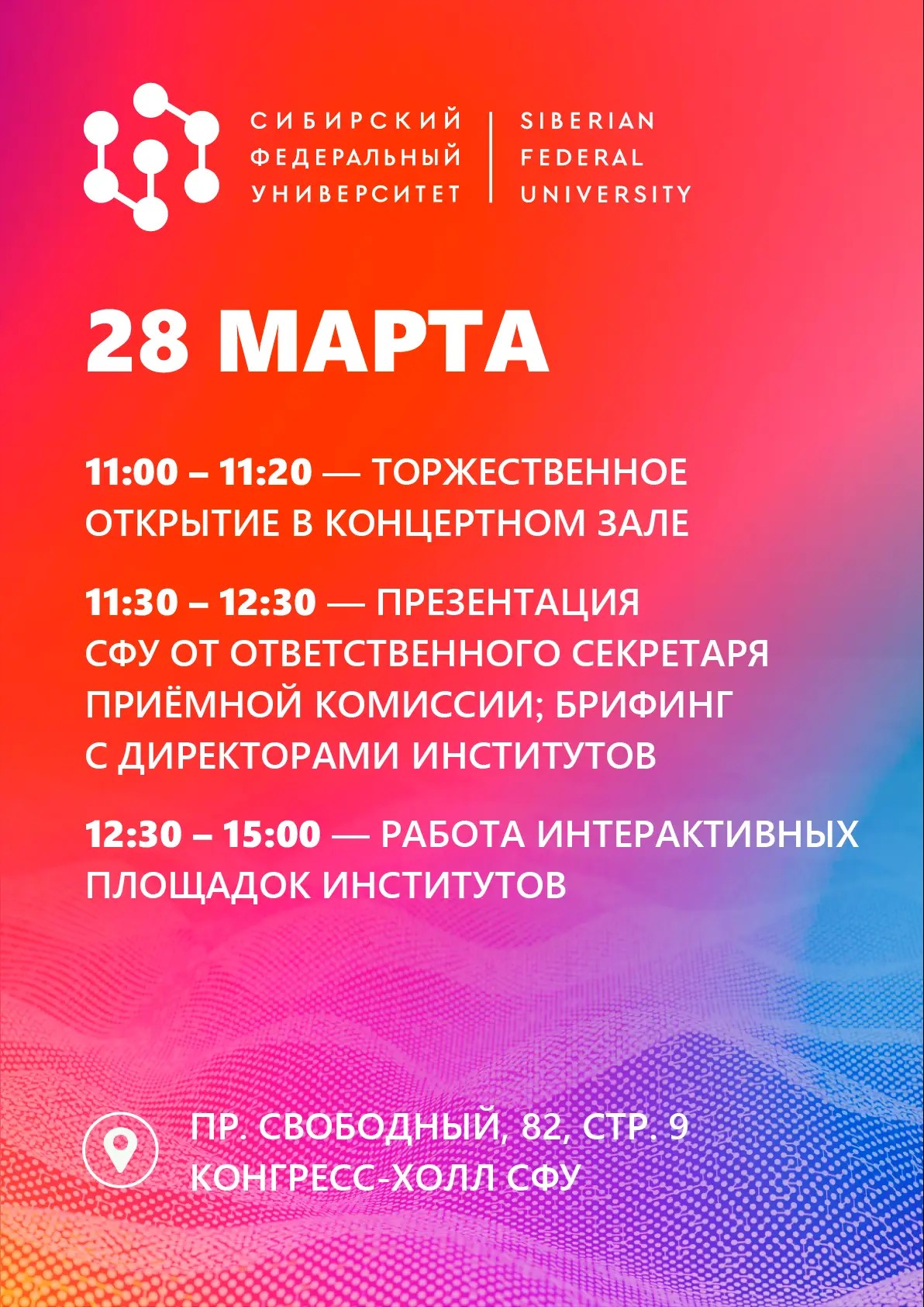 28 марта в Конгресс-холле СФУ состоится большой День открытых дверей. С 11:00 и до 15:00 приглашаем вас окунуться в настоящую студенческую жизнь университета. Представители институтов подробно расскажут о своих образовательных программах, уникальных преимуществах обучения, партнёрских связях и специальных мерах поддержки одарённых первокурсников. Cпециалисты подробно расскажут вам о поступлении в университет и студенческой жизни. Мы поможем разобраться во всех вопросах.