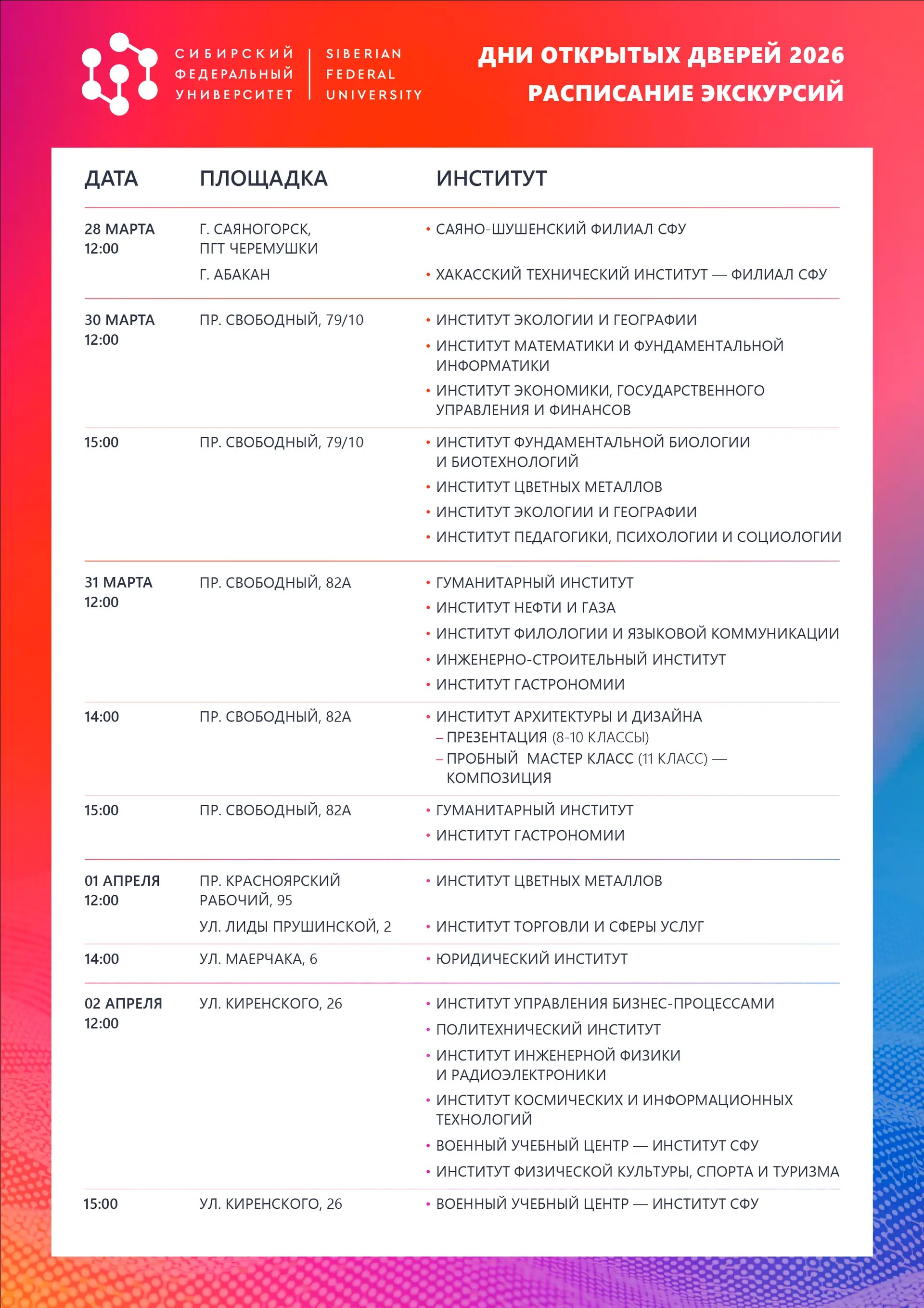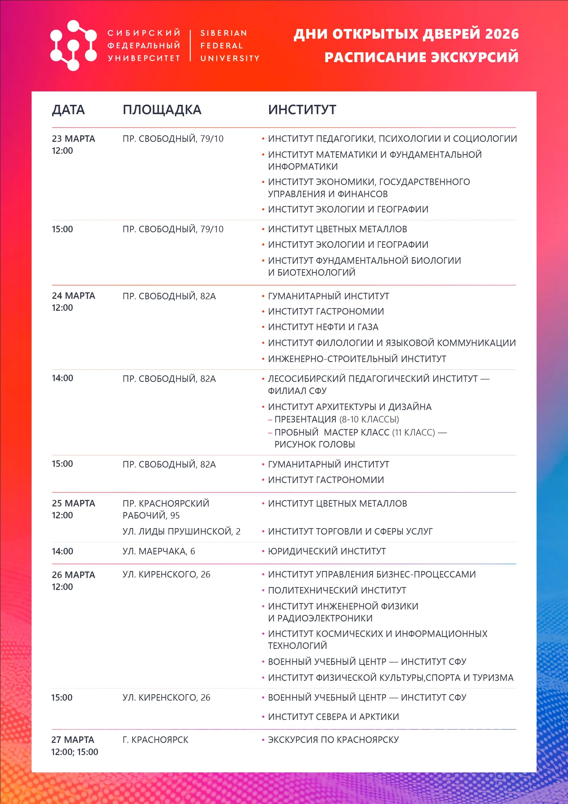 Очные экскурсии для школьников 7–11 классов, их родителей и учителей пройдут с 23 по 26 марта и с 30 марта по 2 апреля, а большие пешая и автобусные экскурсии по кампусу и городу — 27 марта. Регистрация на визиты в институты и пешую экскурсию по ссылке. Запись на автобусную экскурсию проходит только по телефону: +7 (391) 291-27-86 или 8 (800) 550-22-24.